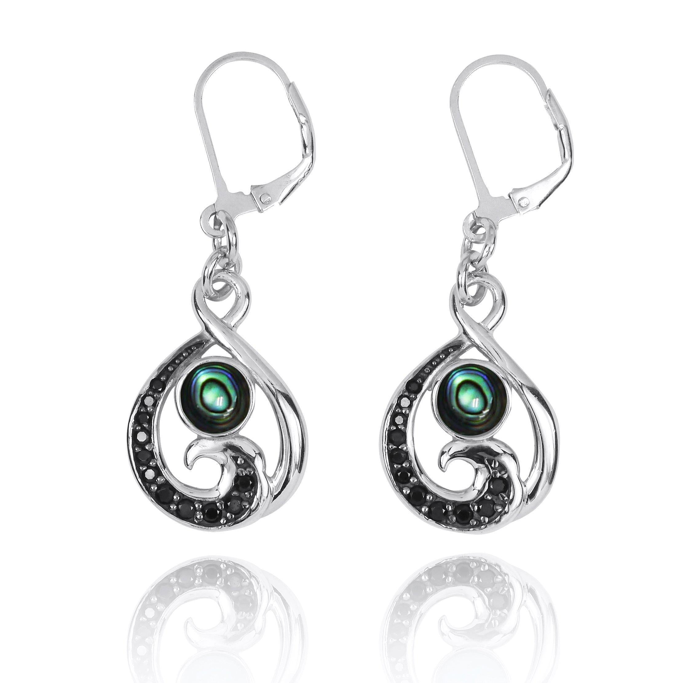 These beautiful lever-back earrings are 925 Sterling Silver and are plated with Rhodium to protect the finish from scratches and tarnishing. The design is enhanced by Abalone Shell and 5 Black Spinel Stones.