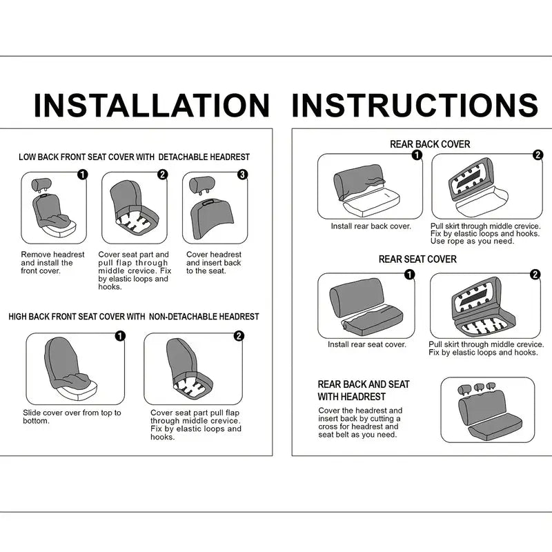 These Car Seat Covers are designed for quick and easy installation on most car and SUV bucket style seats – no tools required. Please make sure to check the measurements in the size chart picture above and compare them to your vehicle before ordering. The elastic backing and fastening system ensures a snug and secure universal fit on most standard car and SUV seats. Please note that these covers are not for use on seats with integrated airbags, seatbelts or armrests.