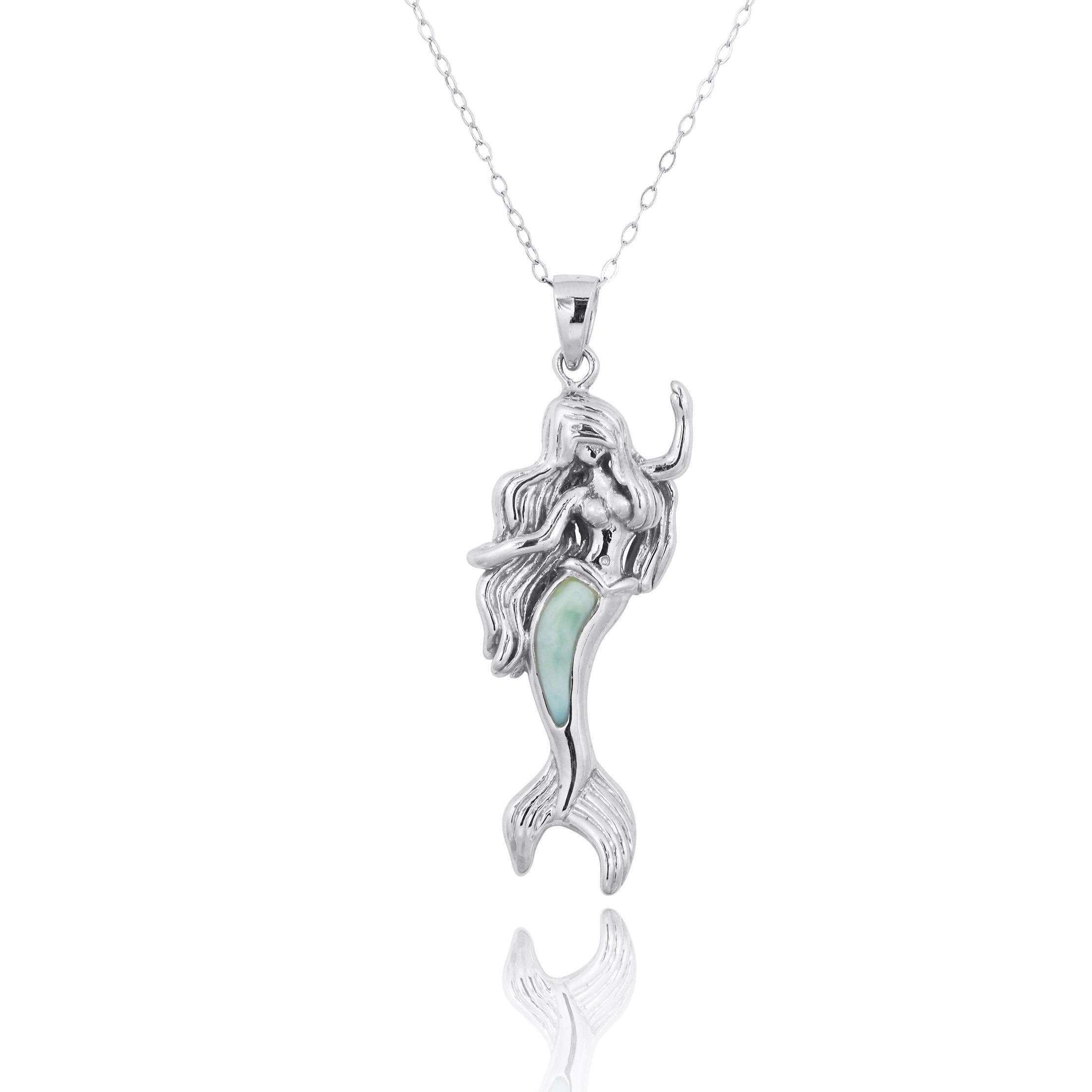 Made of 925 Sterling Silver and plated with Rhodium to protect the finish from scratches and tarnishing. This beautiful pendant features a beautiful mermaid whose tail is highlighted with a semi-precious Larimar stone.