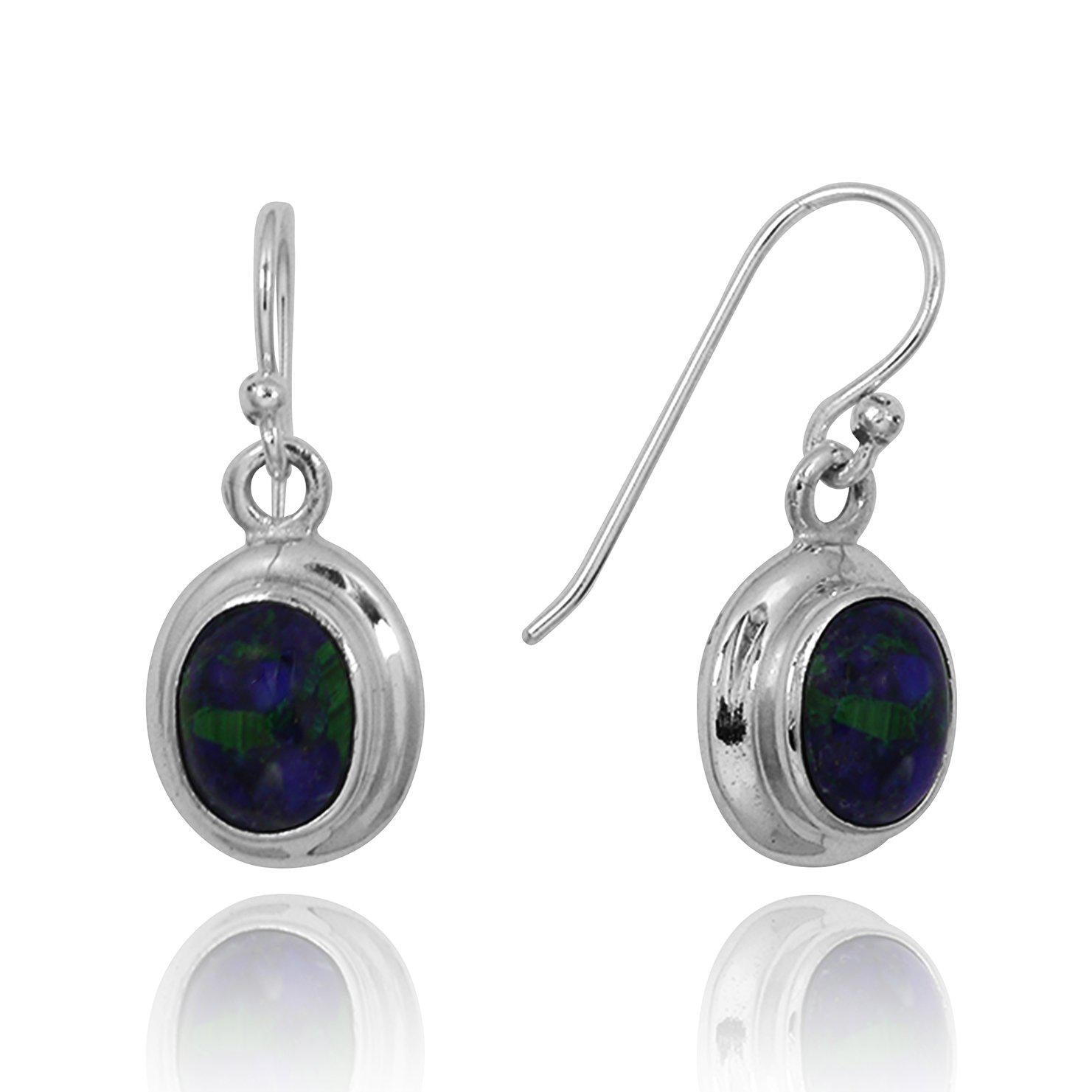 These gorgeous earrings are made of 925 Sterling Silver and plated with Rhodium to protect the finish from scratches and tarnishing. Each earring is embellished with Azurite Malachite gemstones. Only the highest-quality stones are set in our earrings.