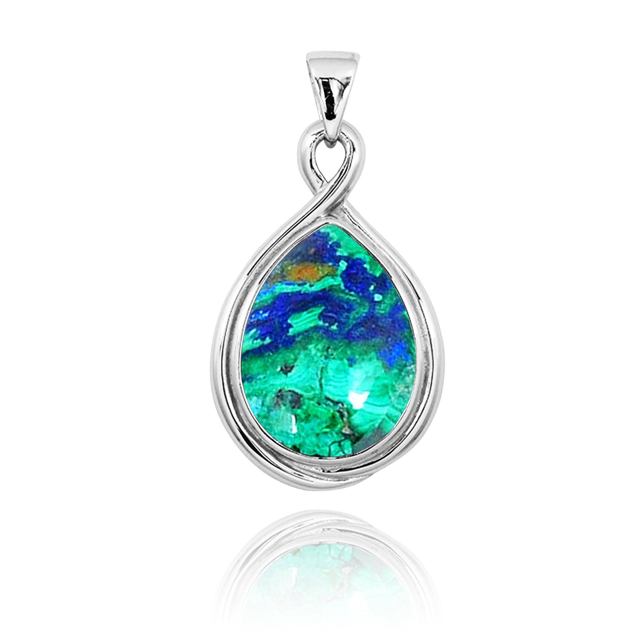 This beautiful pendant necklace is made of 925 Sterling Silver and plated with Rhodium to protect the finish from scratches and tarnishing. The pendant is embellished with Azurite Malachite gemstones. Only the highest-quality stones are set in our pendants.