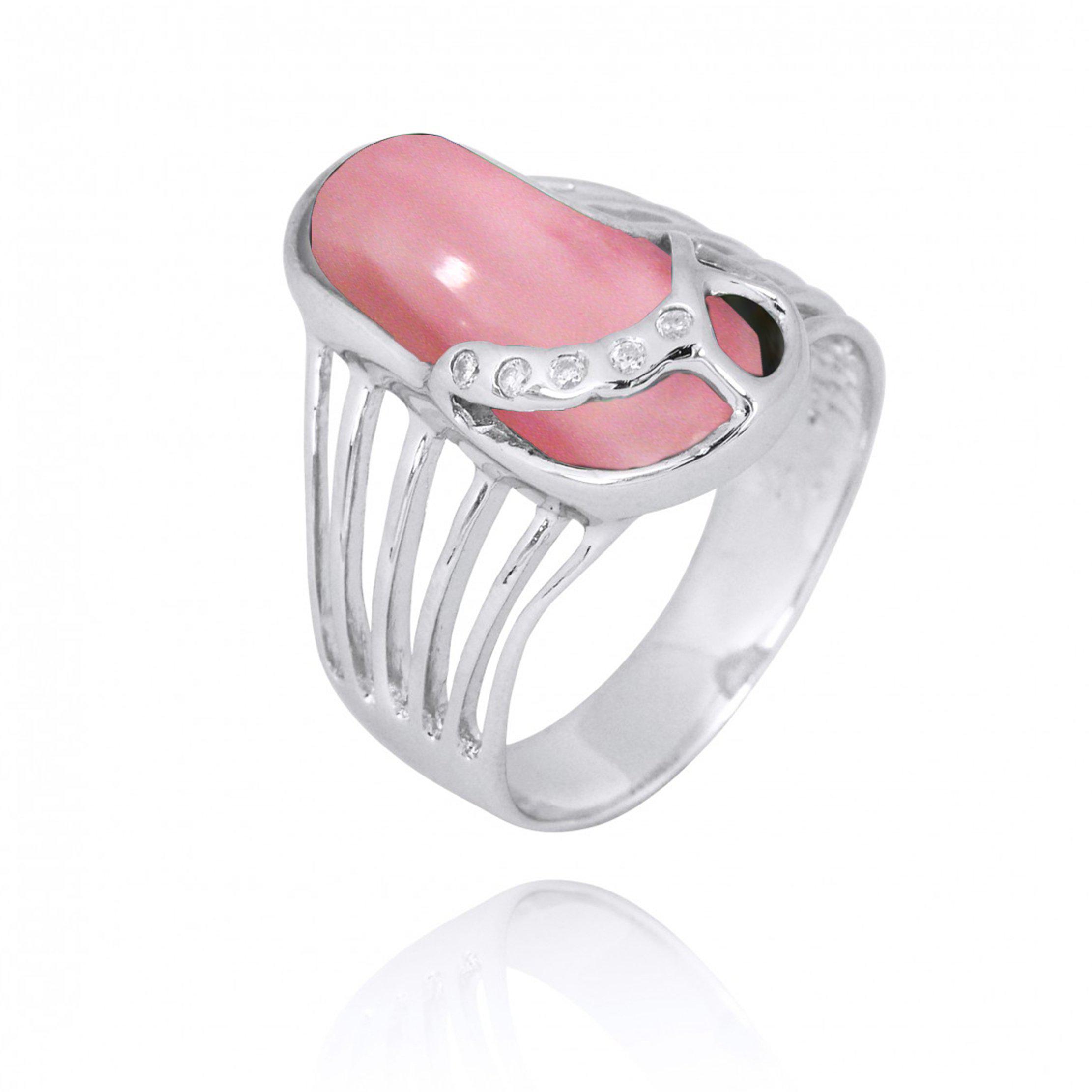 This beautiful ring is 925 Sterling Silver and is plated with Rhodium to protect the finish from scratches and tarnishing. The design is enhanced by 1 Pink Opal gemstone and 5 Cubic Zirconia stones.