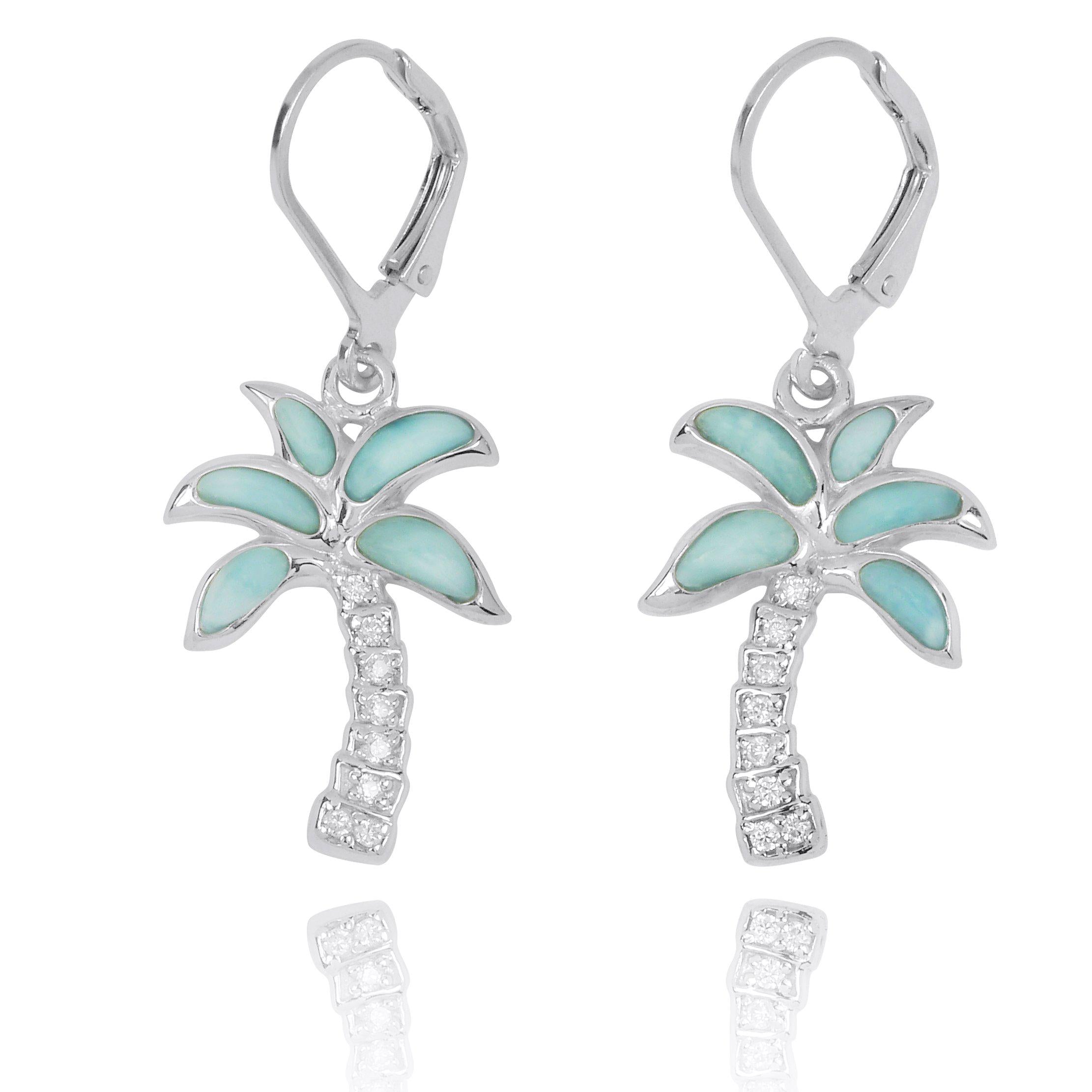 These beautiful earrings are made of 925 Sterling Silver and plated with Rhodium to protect the finish from scratches and tarnishing. Each lever back earring features a tropical palm tree whose leaves are represented by semi-precious Larimar stones and whose trunk is encrusted with eight White Cubic Zirconia that produces more color or 'fire' than a diamond.