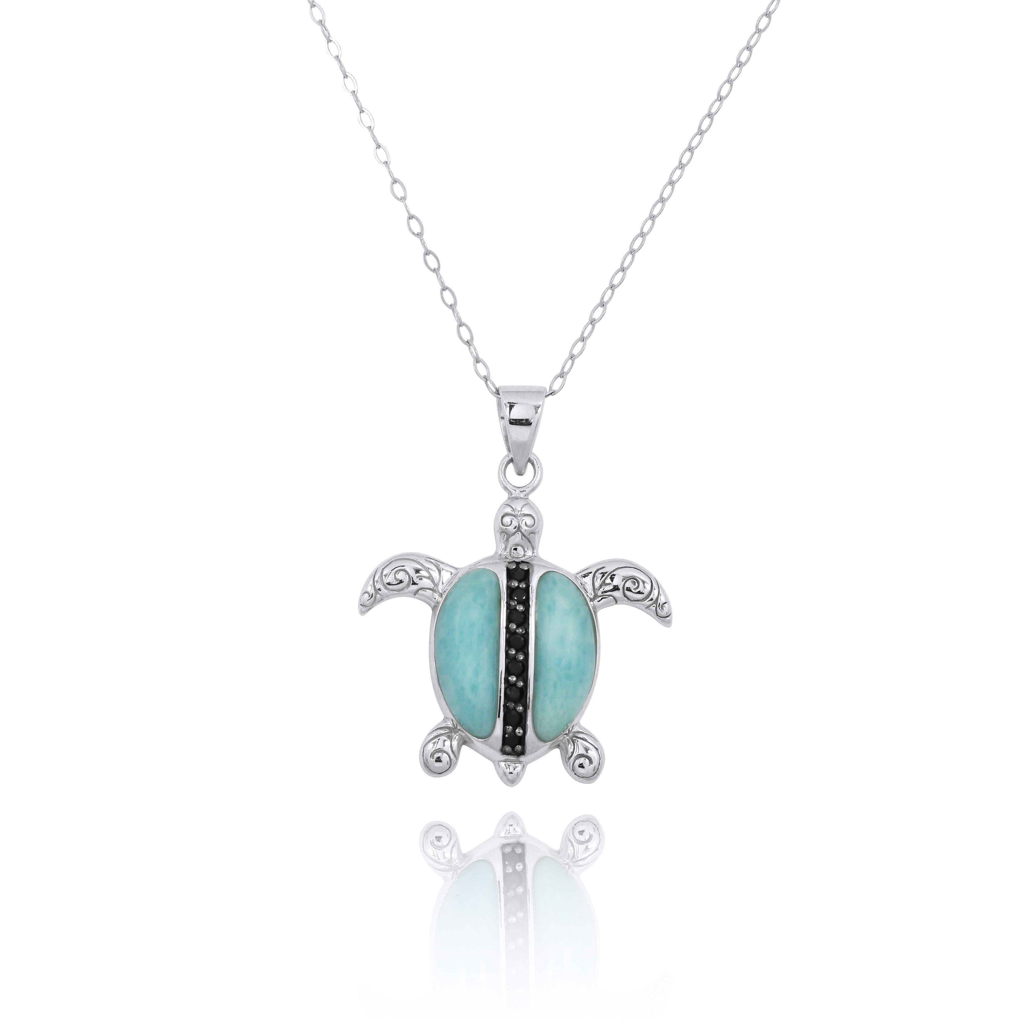 Made of 925 Sterling Silver and plated with Rhodium to protect the finish from scratches and tarnishing. This beautiful pendant features a sea turtle whose shell is detailed with a semi-precious Larimar stone and rare Black Spinel gemstones.