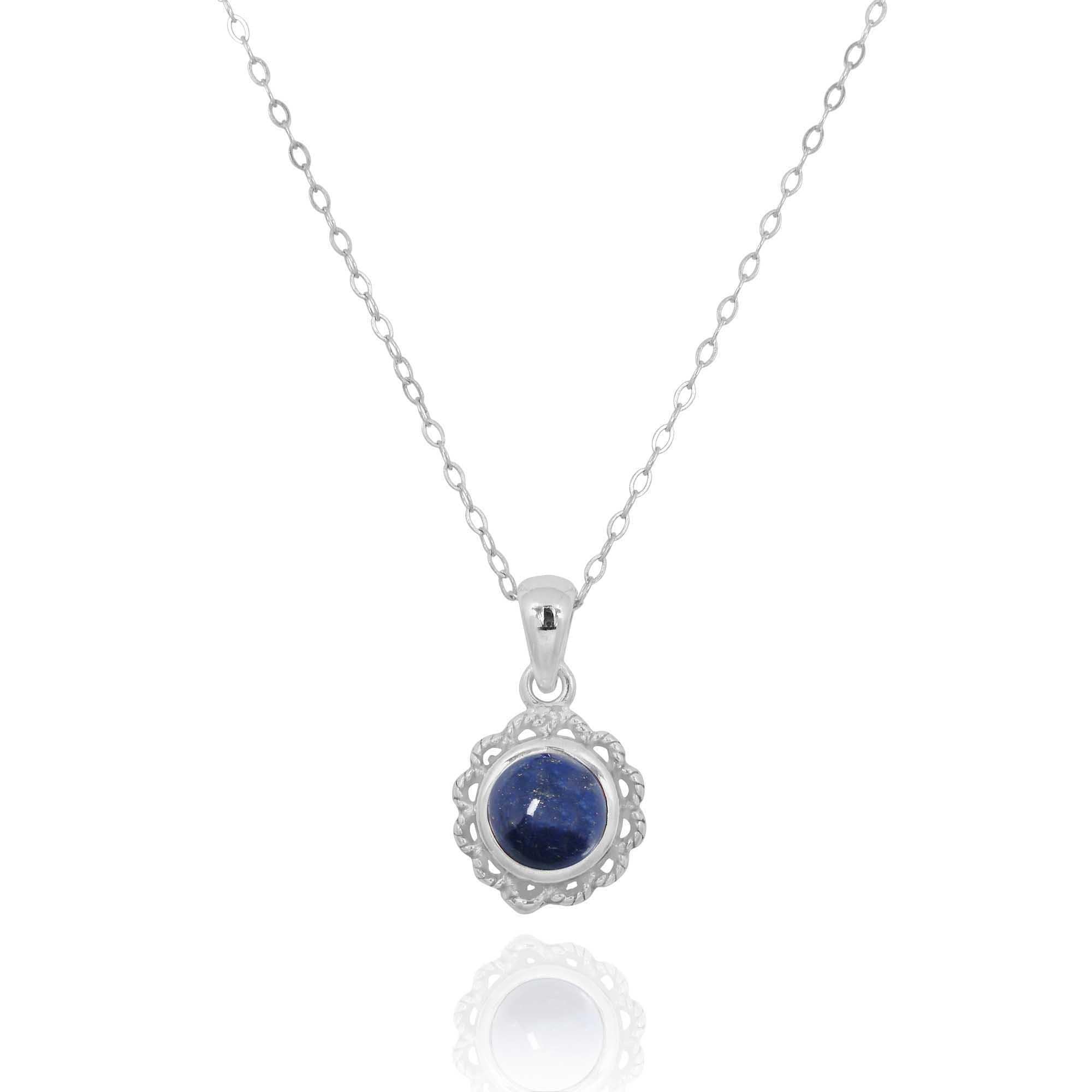 This exquisite pendant is made of 925 Sterling Silver and plated with Rhodium to protect the finish from scratches and tarnishing. The pendant is adorned with a semi-precious  Lapis stone. Only the highest-quality stones are set in our earrings.