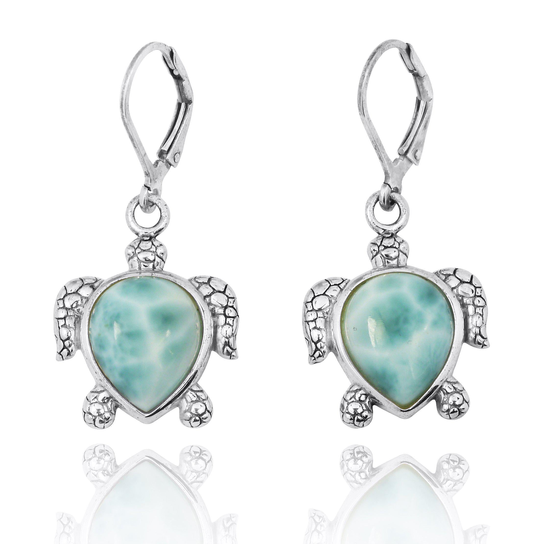 These beautiful earrings are made of 925 Sterling Silver and plated with Rhodium to protect the finish from scratches and tarnishing. Each lever-back earring features a sea turtle whose shell is adorned with semi-precious Larimar stones.