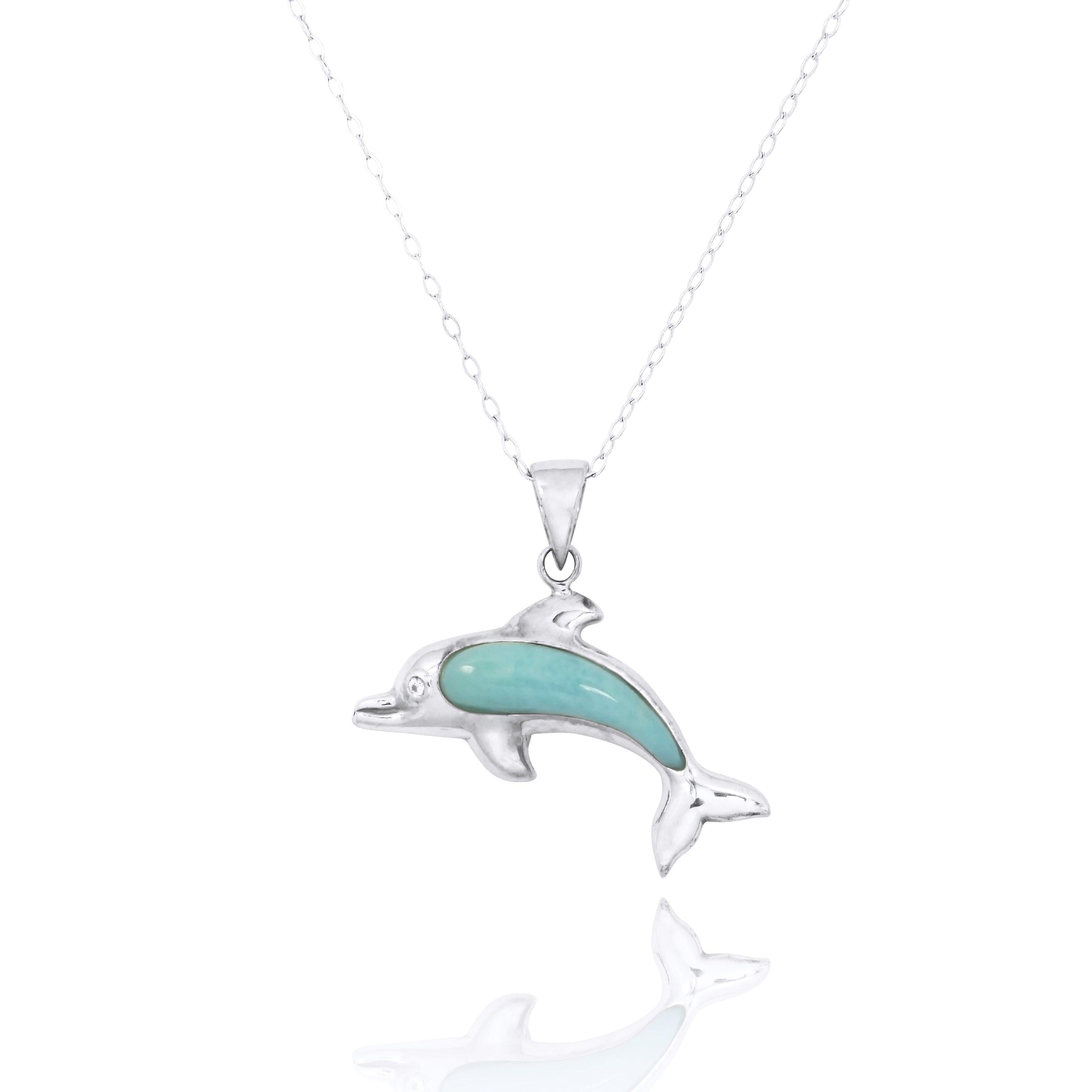 Made of 925 Sterling Silver and plated with Rhodium to protect the finish from scratches and tarnishing. This beautiful pendant features a dolphin crafted from the semi-precious stone Larimar.
