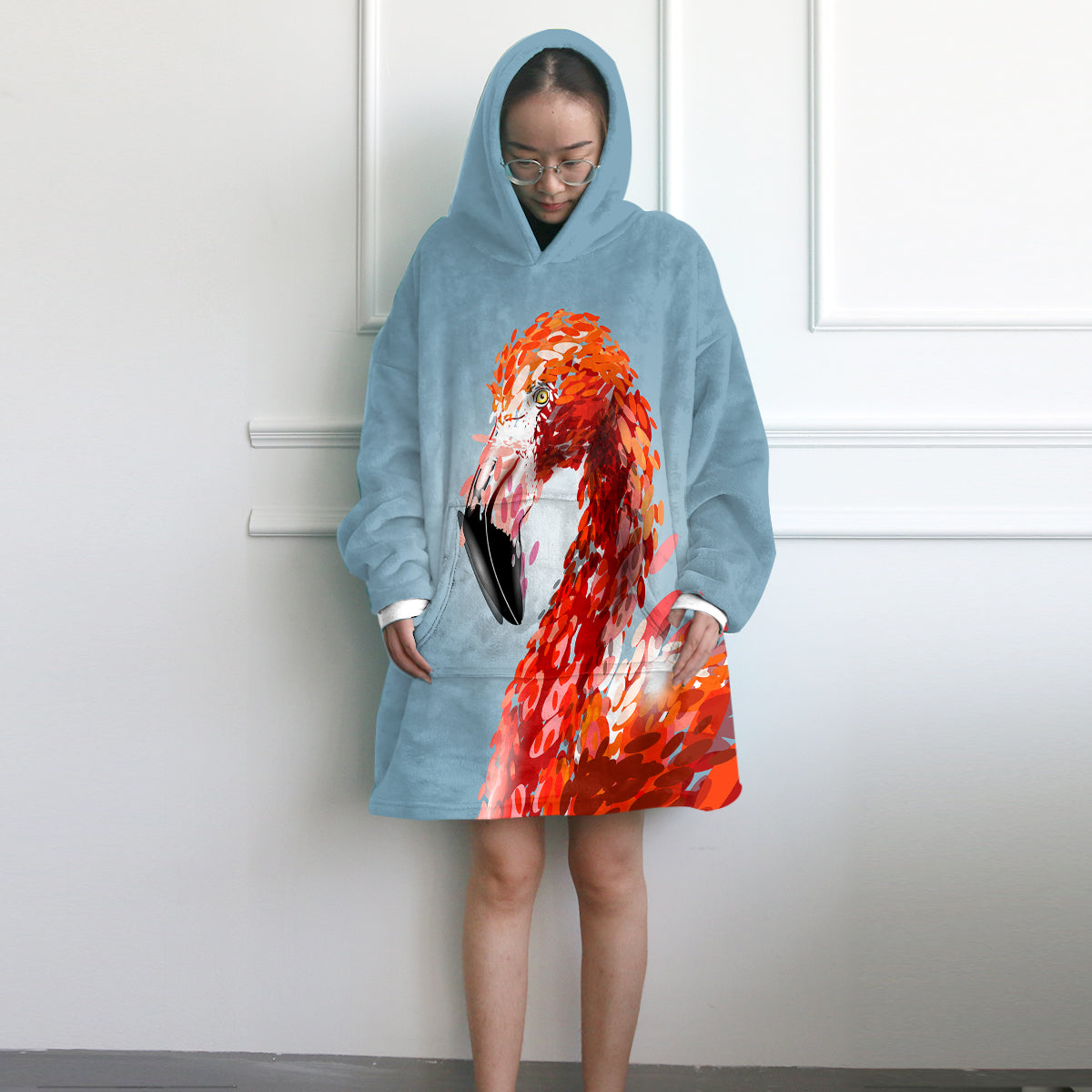 This blanket is designed like an oversized sweatshirt with a hood making it extremely comfortable to wear. The addition of a kangaroo pocket is useful to keep your phone or remote control at hand. The fleece shell is super soft and perfect for cuddling. A fluffy sherpa layer on the inside provides extra warmth and comfort.