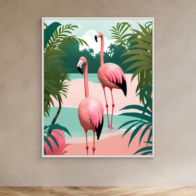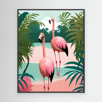 From The Artist: A serene scene of two pink flamingos standing by a lush tropical shoreline, surrounded by vibrant green foliage and soft pastel tones. Perfect for adding a touch of exotic beauty to any space.